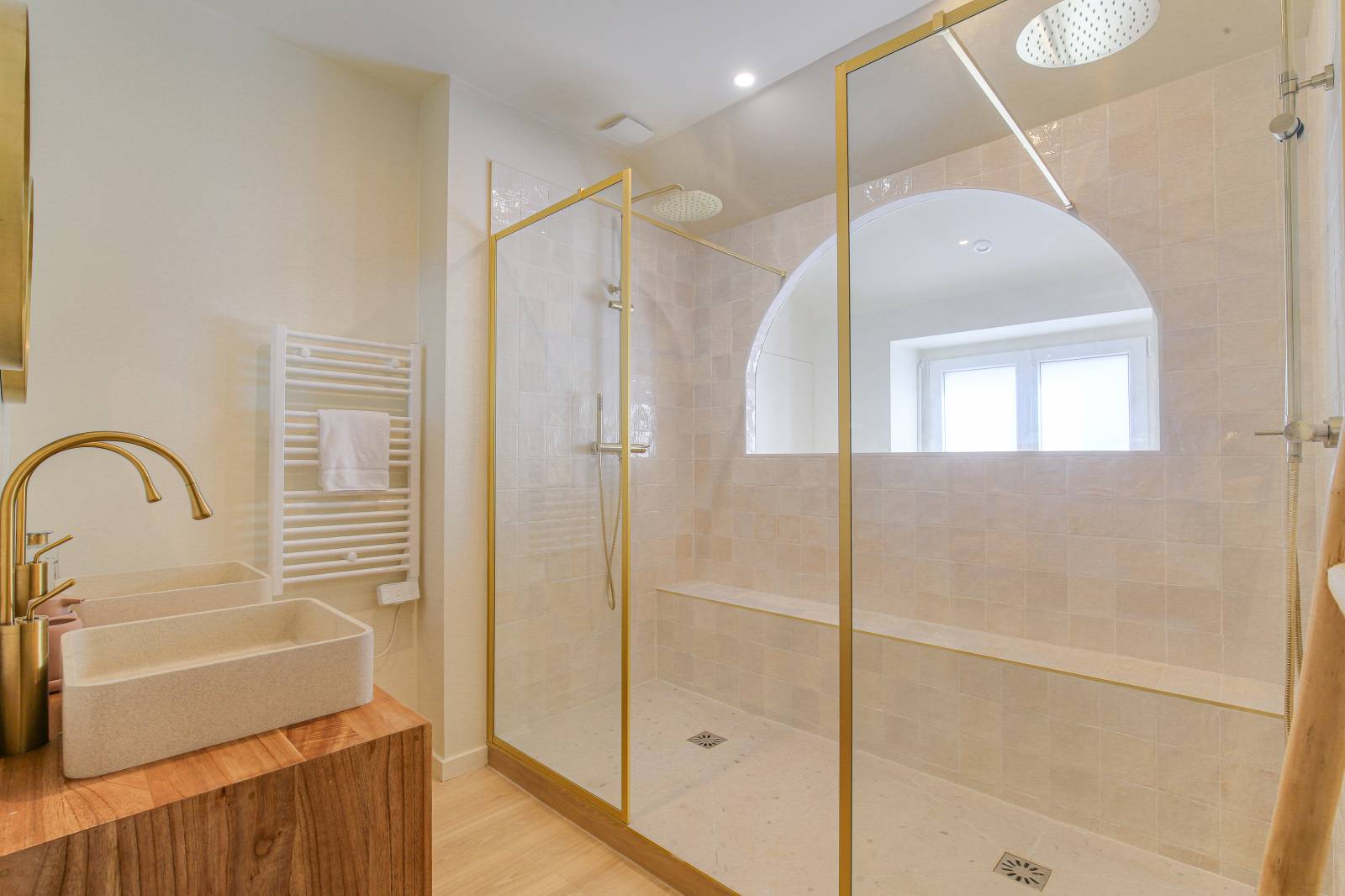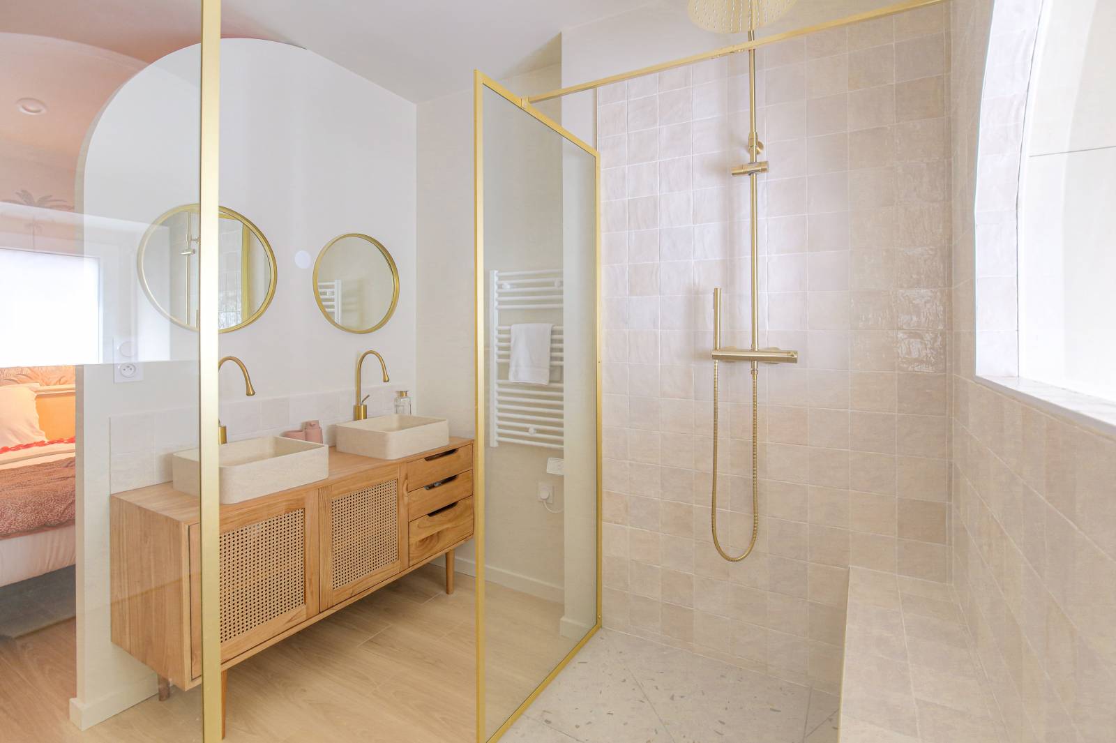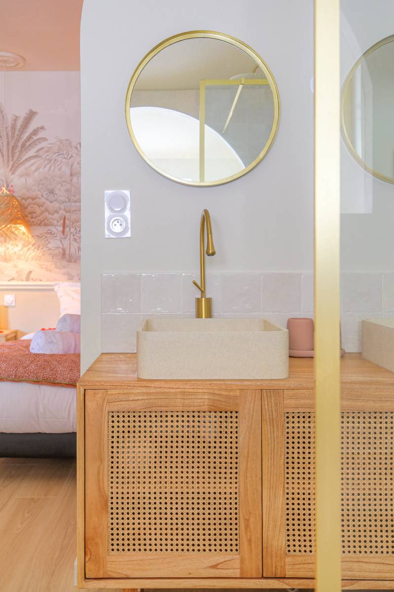 La salle de bain devient alors la pièce maitresse de cette rénovation avec sa douche atypique et chic. Notre architecte et les clients ont travaillé ensemble le choix des couleurs pour créer une harmonie douce et chaleureuse.