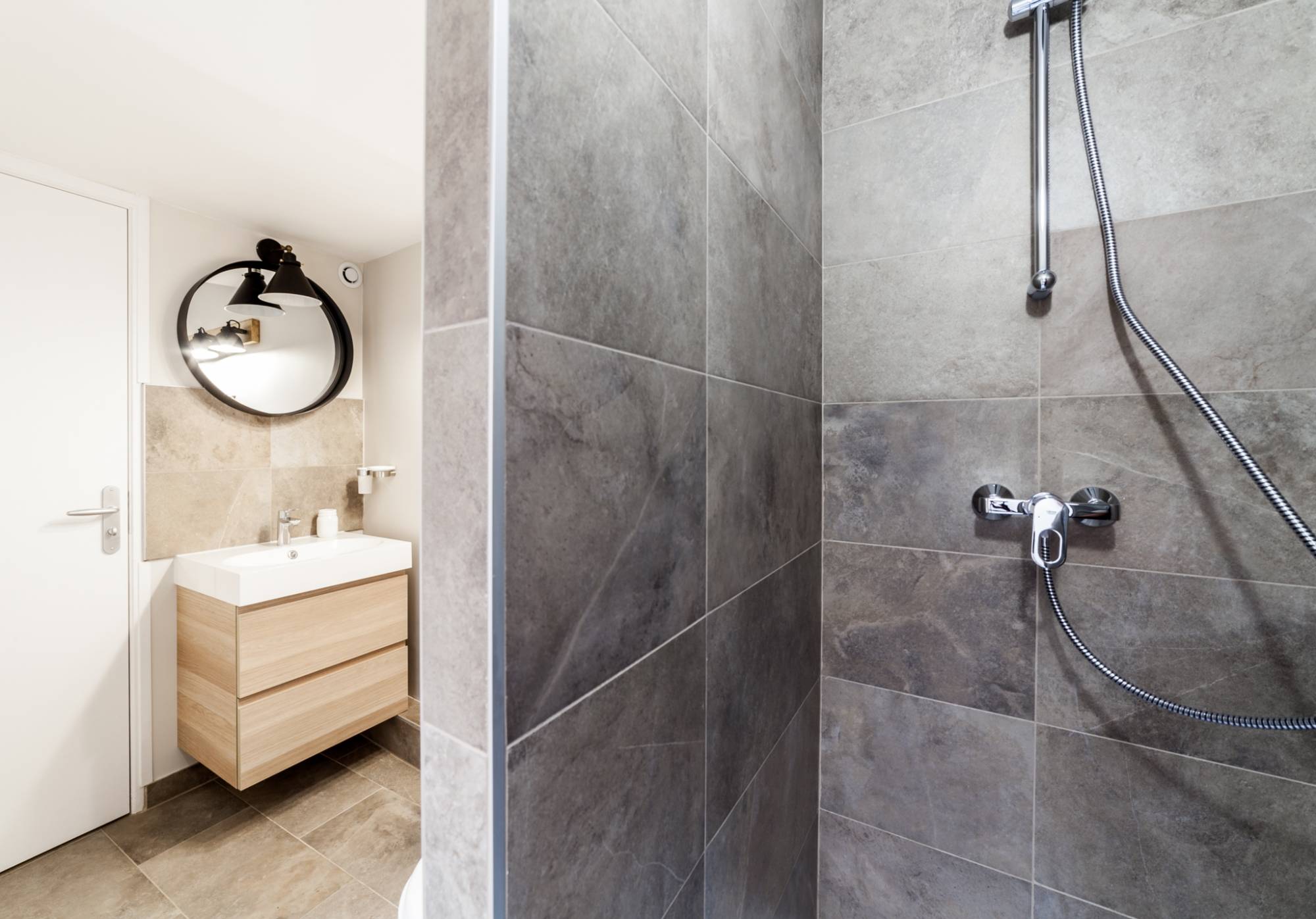 Un sol stratifié a été installé dans la pièce de vie et un carrelage effet parquet dans la chambre balnéo pour en faire des