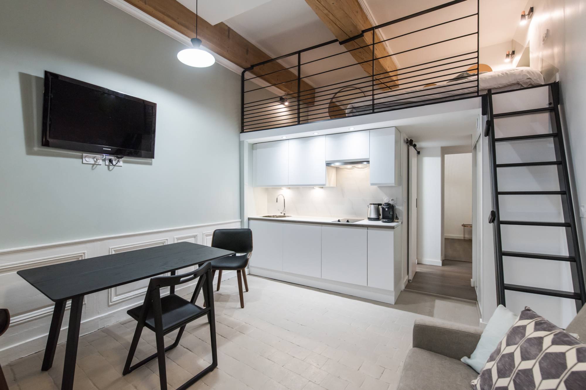 Le plus grand des appartements, avec une surface de 36m², comprend une modification de la cuisine existante en chambre. Elle devient donc une pièce à part et ne donne pas sur l'espace de vie. Les travaux de plomberie ont permis de déplacer les points d'eau. Cuisine et salle de bain sont réunis sous la