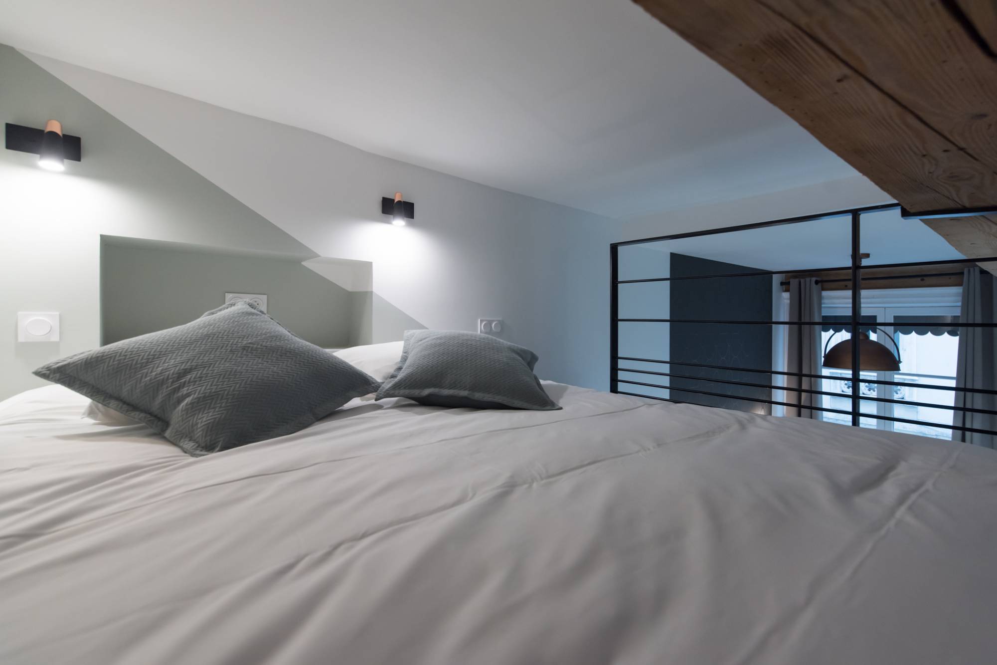 mezzanine; un couchage supplémentaire est donc crée au-dessus, donnant sur le salon.